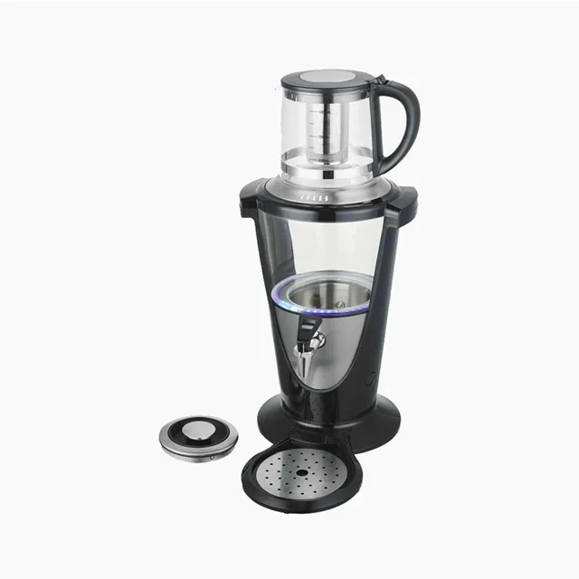 - قسمت سماور این سماور کشیده و دو بخشی است. قسمت پایینی رنگ و جنسی از استیل دارد و قسمت بالایی شیشهای است تا درخشش آب در آن مشخص باشد.